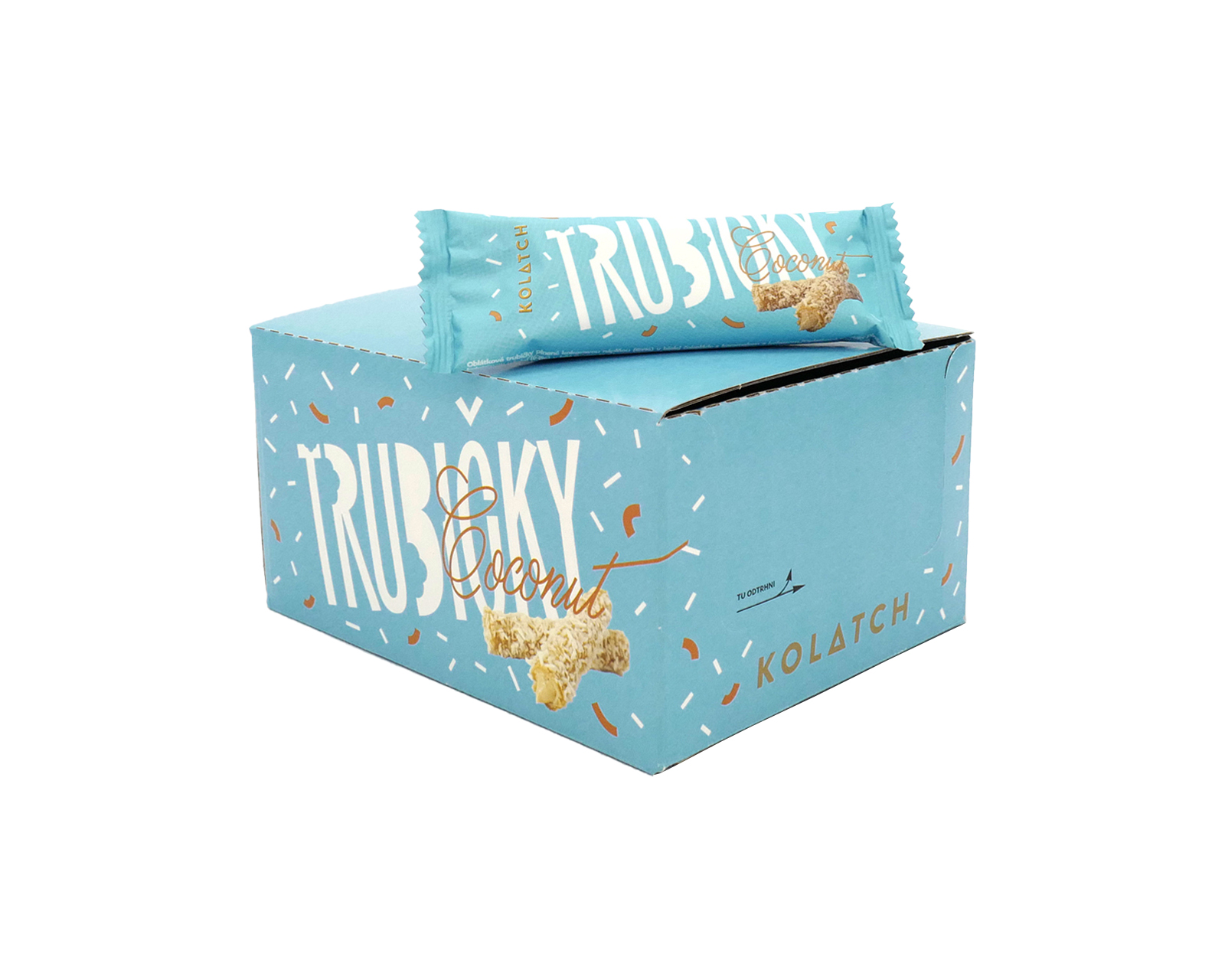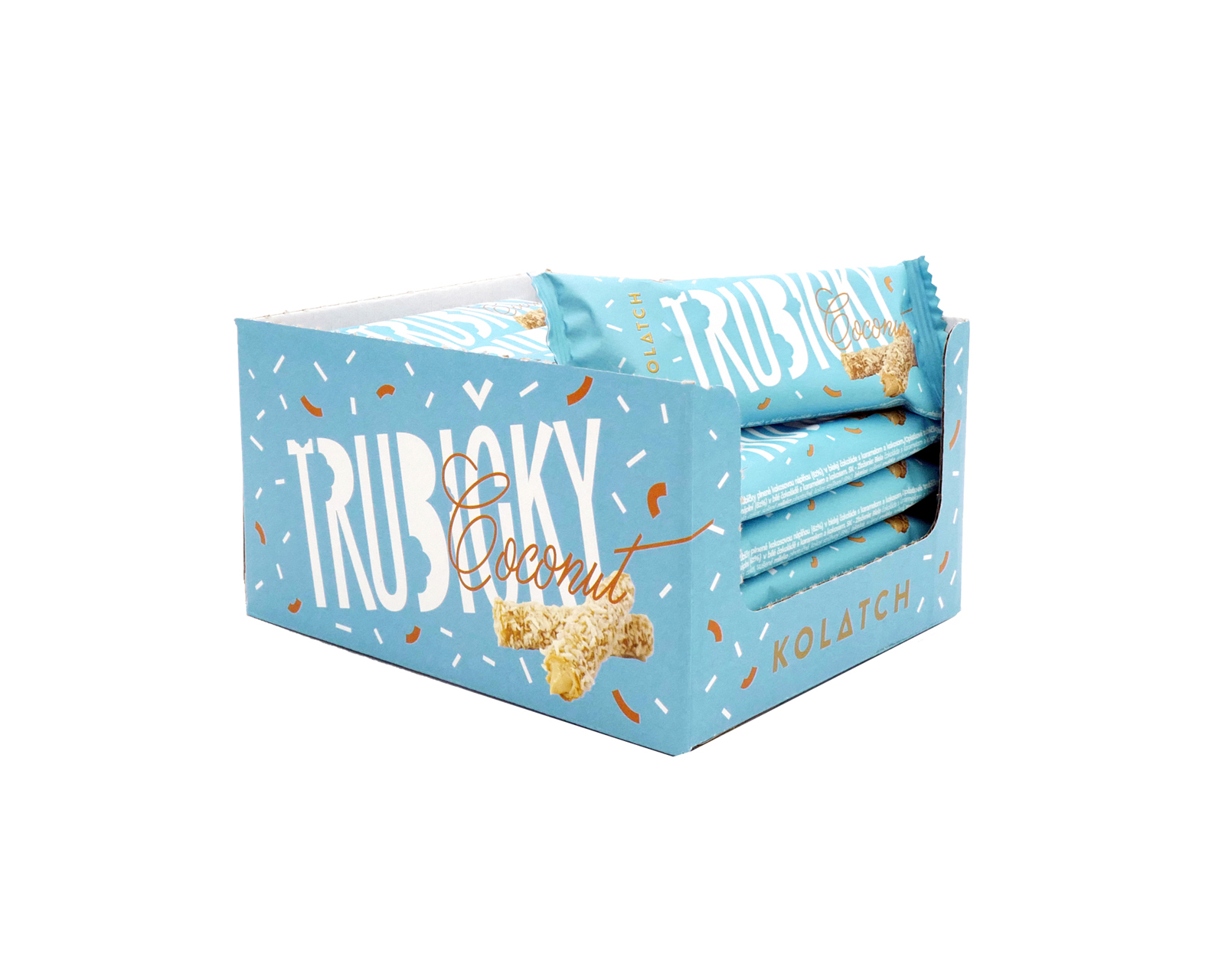 Oblátkové trubičky plnené kokosovou náplňou (62%) v bielej čokoláde s karamelom a kokosom 35g. Slovenský výrobok. Cena za 100g výrobku - 4,022€.