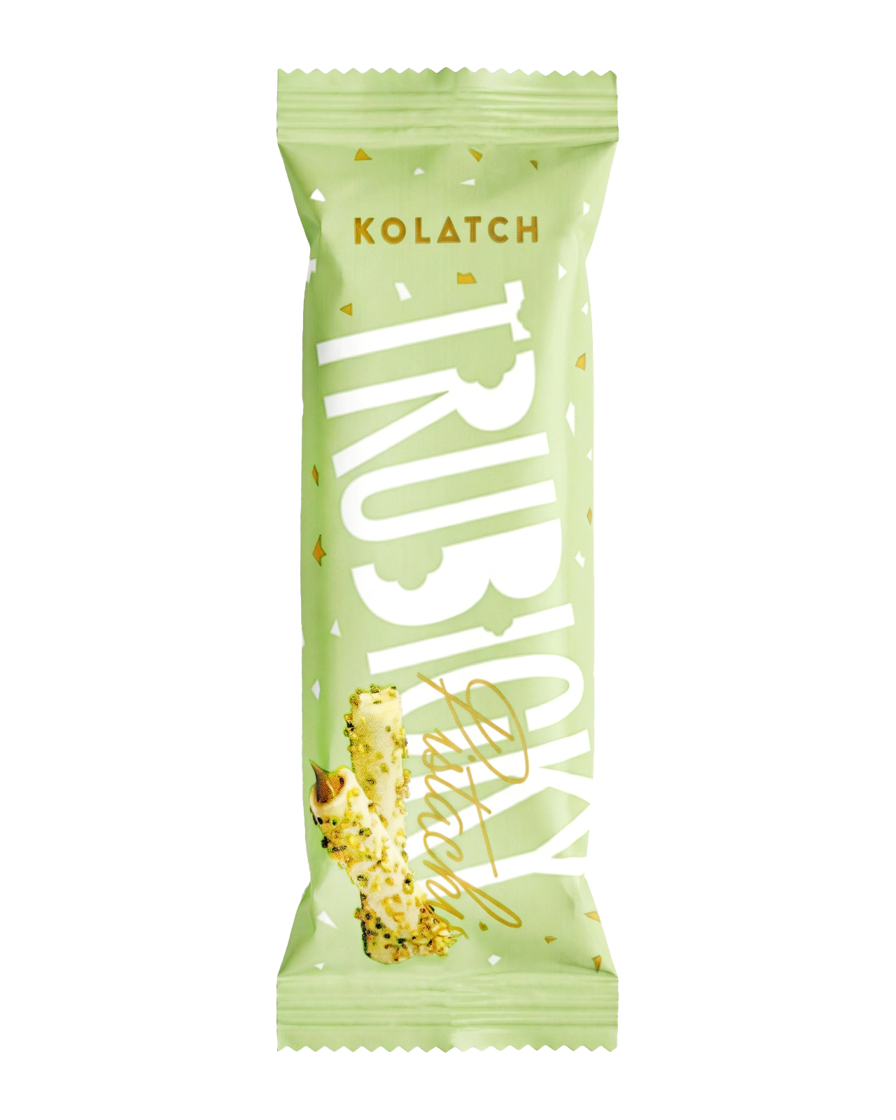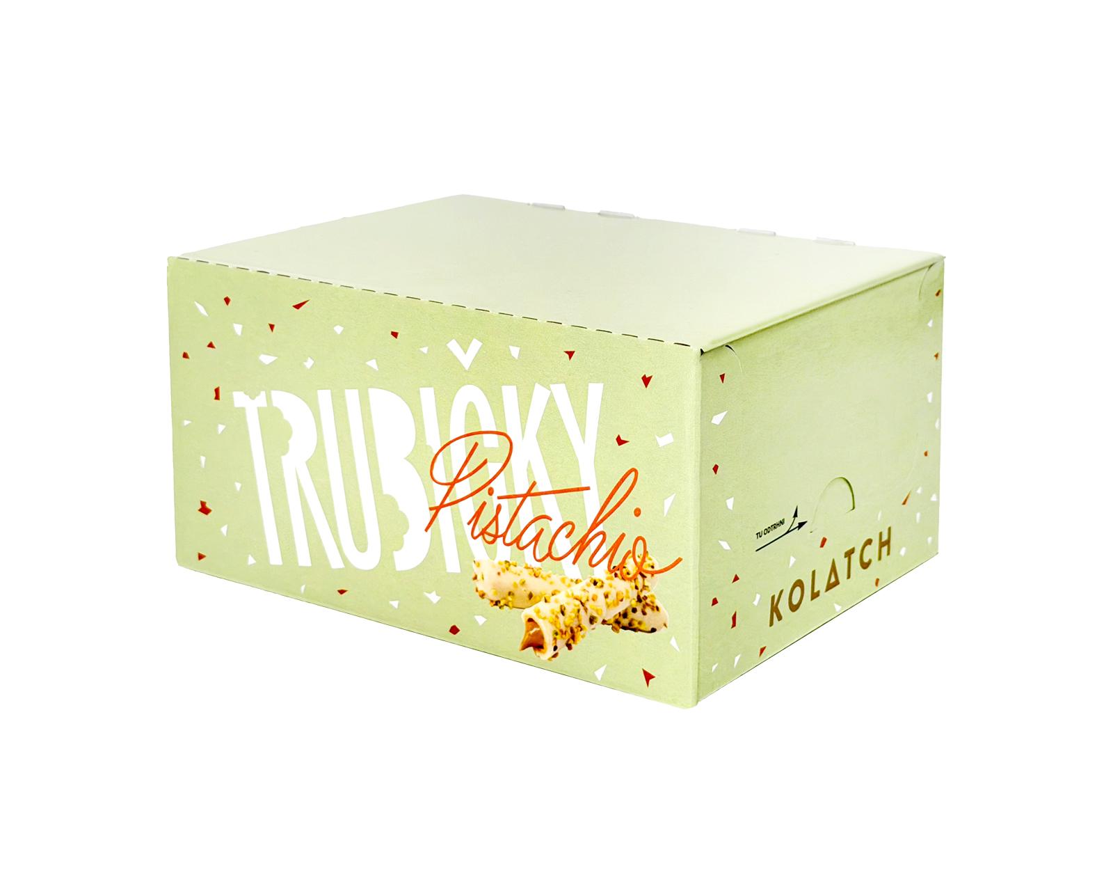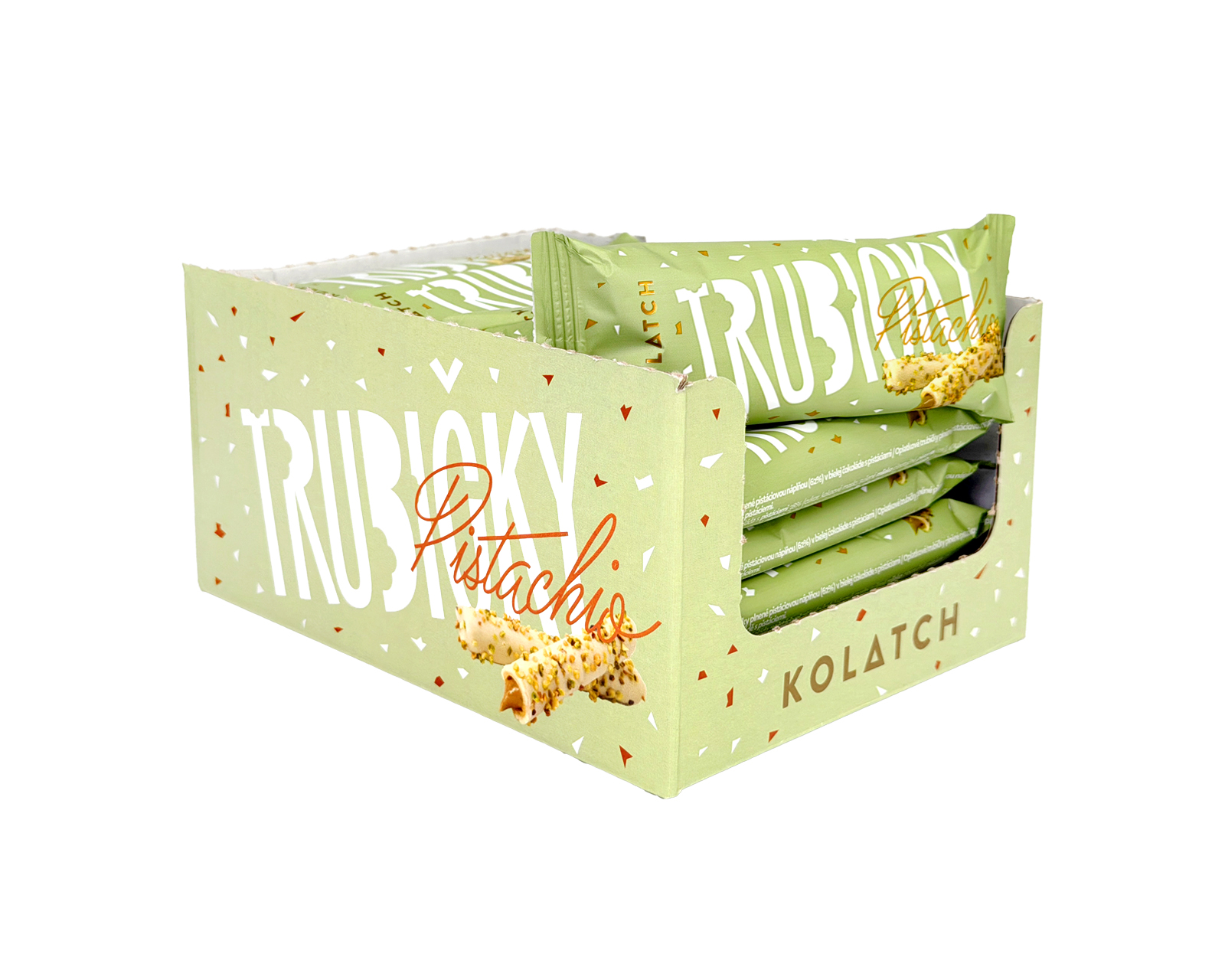Trubičky plnené pistáciovou náplňou (62%) v bielej čokoláde s pistáciami 35g. Slovenský výrobok. Cena za 100g výrobku - 4,022€.