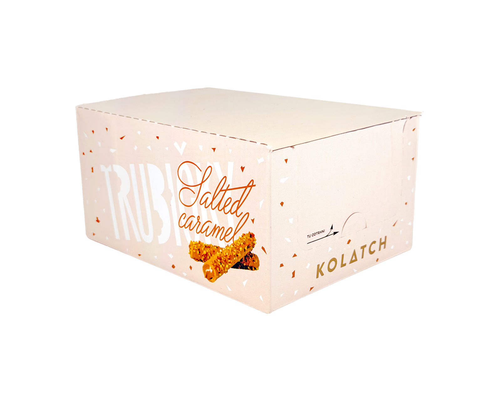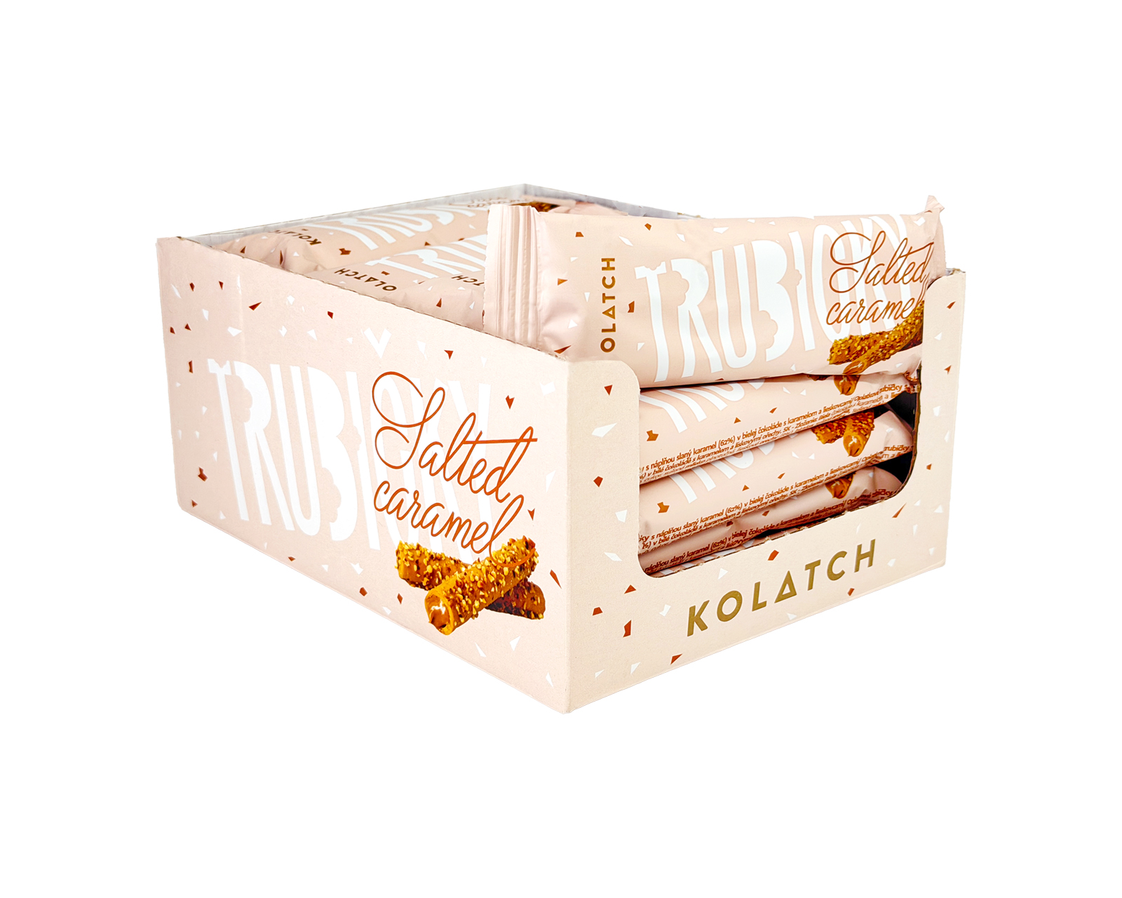 Trubičky s náplňou slaný karamel (62%) v bielej čokoláde s karamelom a lieskovcami 35g. Slovenský výrobok. Cena za 100g výrobku - 3,685€.